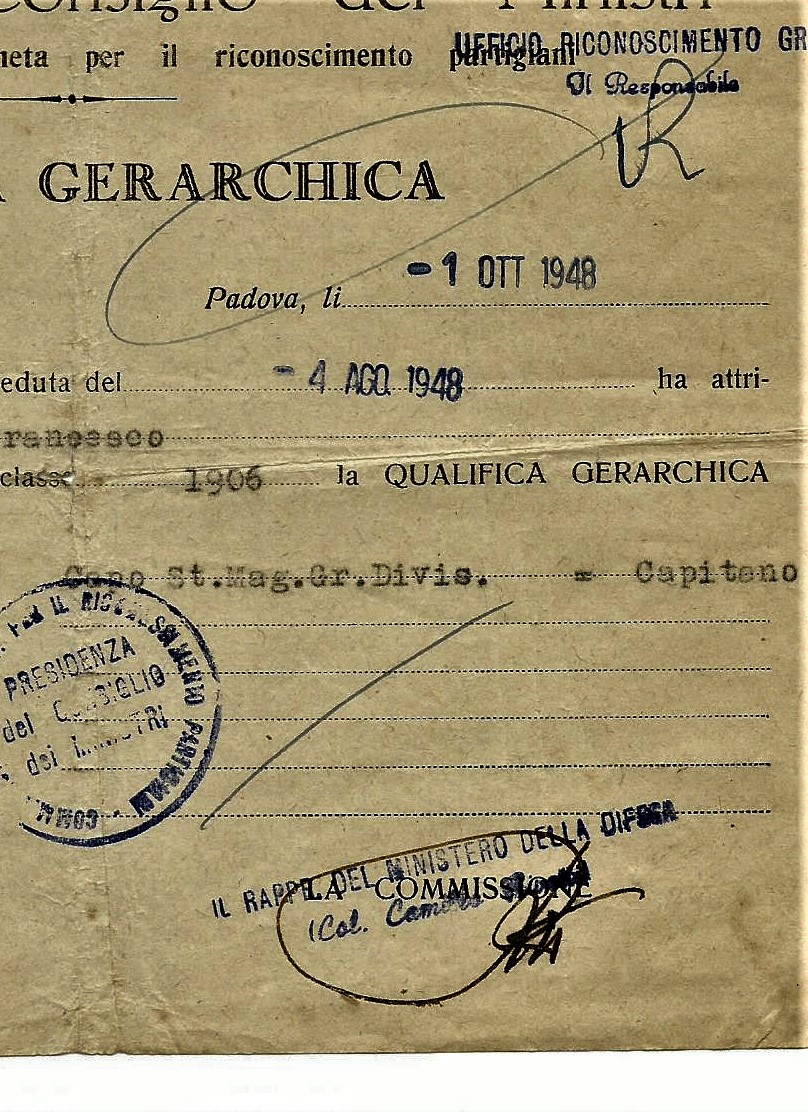 Per il territorio veneziano ha intrattenuto relazioni con Ferruccio Parri e altri ministri del Governo. Il Partito Liberale lo ha candidato per entrare nell’Assemblea Costituente e ha ricevuto diverse onorificenze: un certificato degli Alleati che lo ringraziava per l’aiuto concesso ai soldati, permettendo loro di fuggire e di evitare la cattura da parte del nemico e il conferimento del titolo di Commendatore dell’Ordine della Corona d’Italia da parte di Umberto II, il “Re di Maggio”.