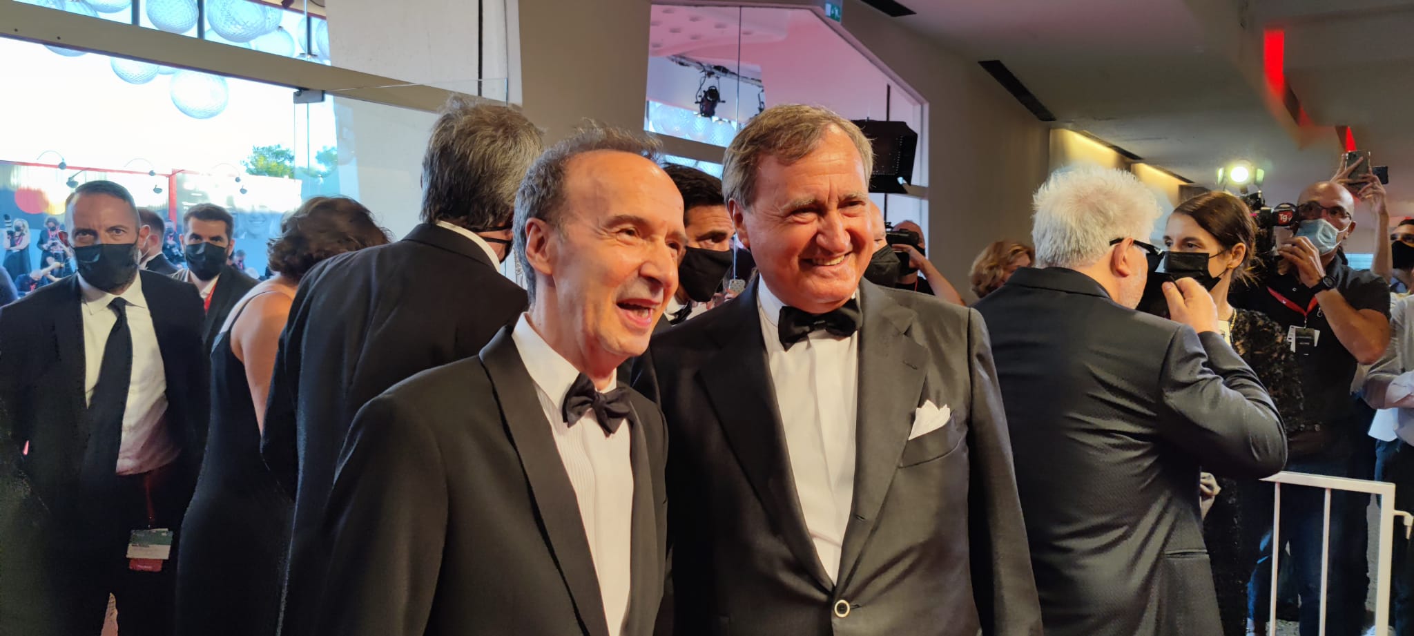 Benigni è stato accolto in Sala Grande da una standing ovation, così come il Presidente Mattarella, ospite per la terza volta del presidente della Biennale, Roberto Cicutto, e del direttore del festival, Alberto Barbera, dopo le edizioni del 2015 e del 2017.