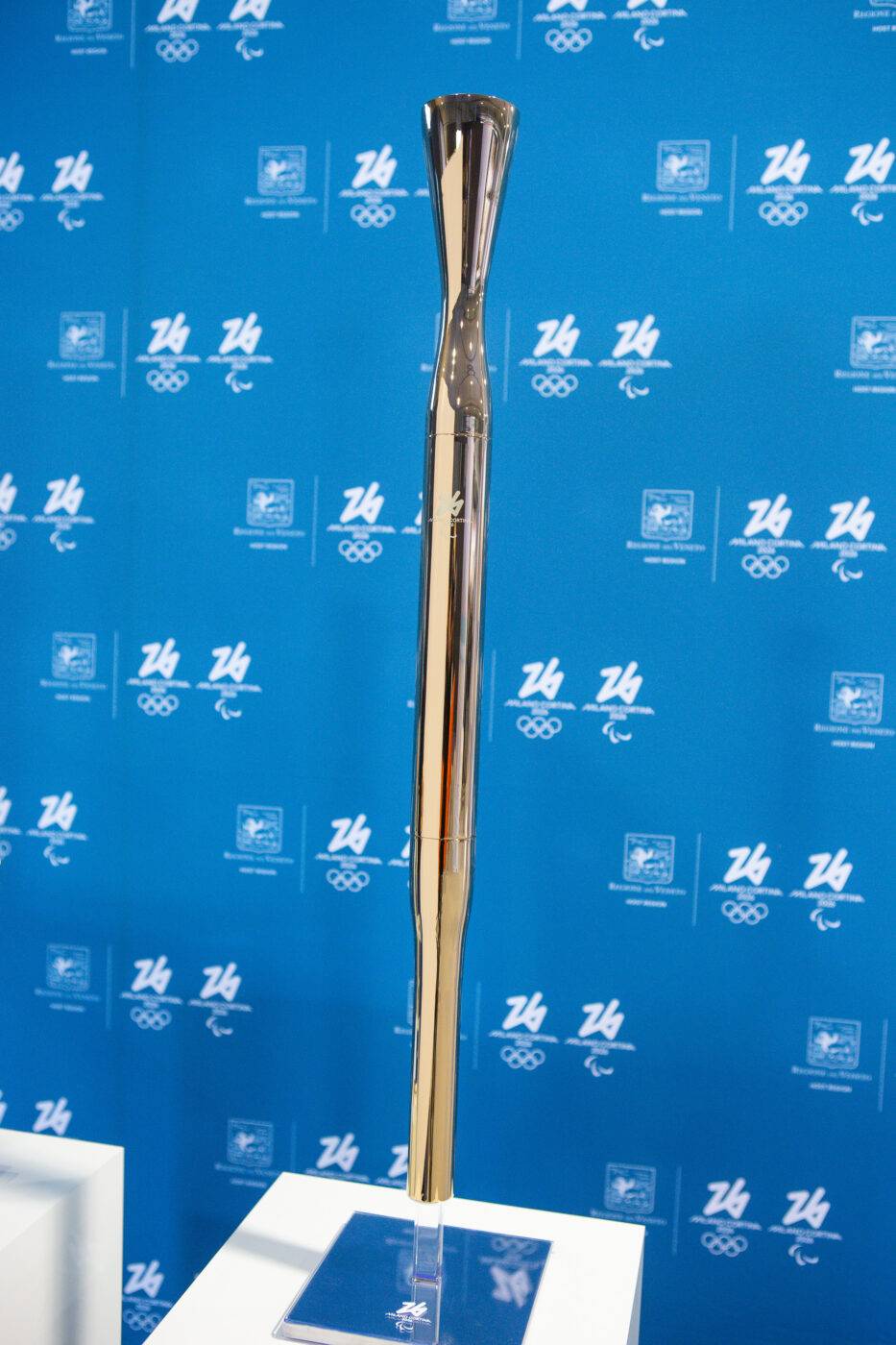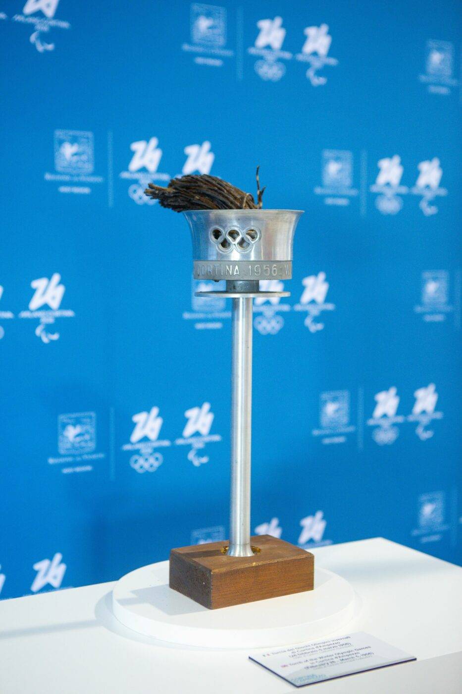 Fa bella mostra di sé una fiaccola olimpica originale del 1956 che trova posto a fianco di quella del 2026.