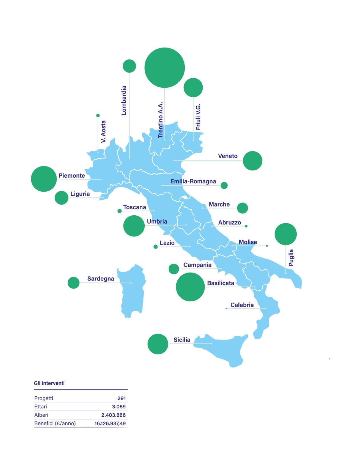 I dati riportati dall’Atlante, relativi al 2023 – con le nuove piantumazioni calcolate fino a marzo 2024, mese in cui termine la stagione della messa a dimora – riferiscono di 2,4 milioni di alberi piantati, su una superficie pari a oltre 3.000 ettari; un investimento, questo, che genererà un ritorno economico calcolato su 16 milioni di euro all’anno.