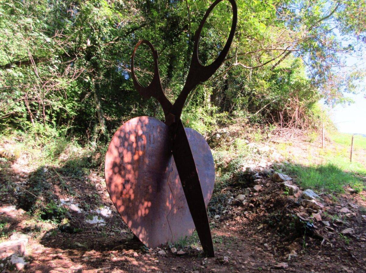Un insieme che invita a esplorare non solo il paesaggio che circonda, ma anche il proprio cuore, scoprendo nuovi significati e prospettive sull’amore. Ci sono, solo per fare alcuni esempi delle opere che si incontrano lungo il sentiero dell’Amore, “L’innocenza “, installazioni composta da tre barchette che richiamano la forma di quelle di carta che si facevano durante l’infanzia a simboleggiare i primi amori adolescenziali mentre il “Cuore Contemporaneo” di Diego Morlin e Giuseppe Bucco, realizzato assemblando con maestria oggetti di scarto come ingranaggi arrugginiti, vecchi motori, vasi, contenitori, bulloni, pezzi contorti di metallo è rappresentativo di rinascita e trasformazione, ricordando che anche ciò che consideriamo inutile può avere valore se osservato con occhi diversi. “Cuore Contemporaneo” è anche indicativo del caos che spesso accompagna l’amore.