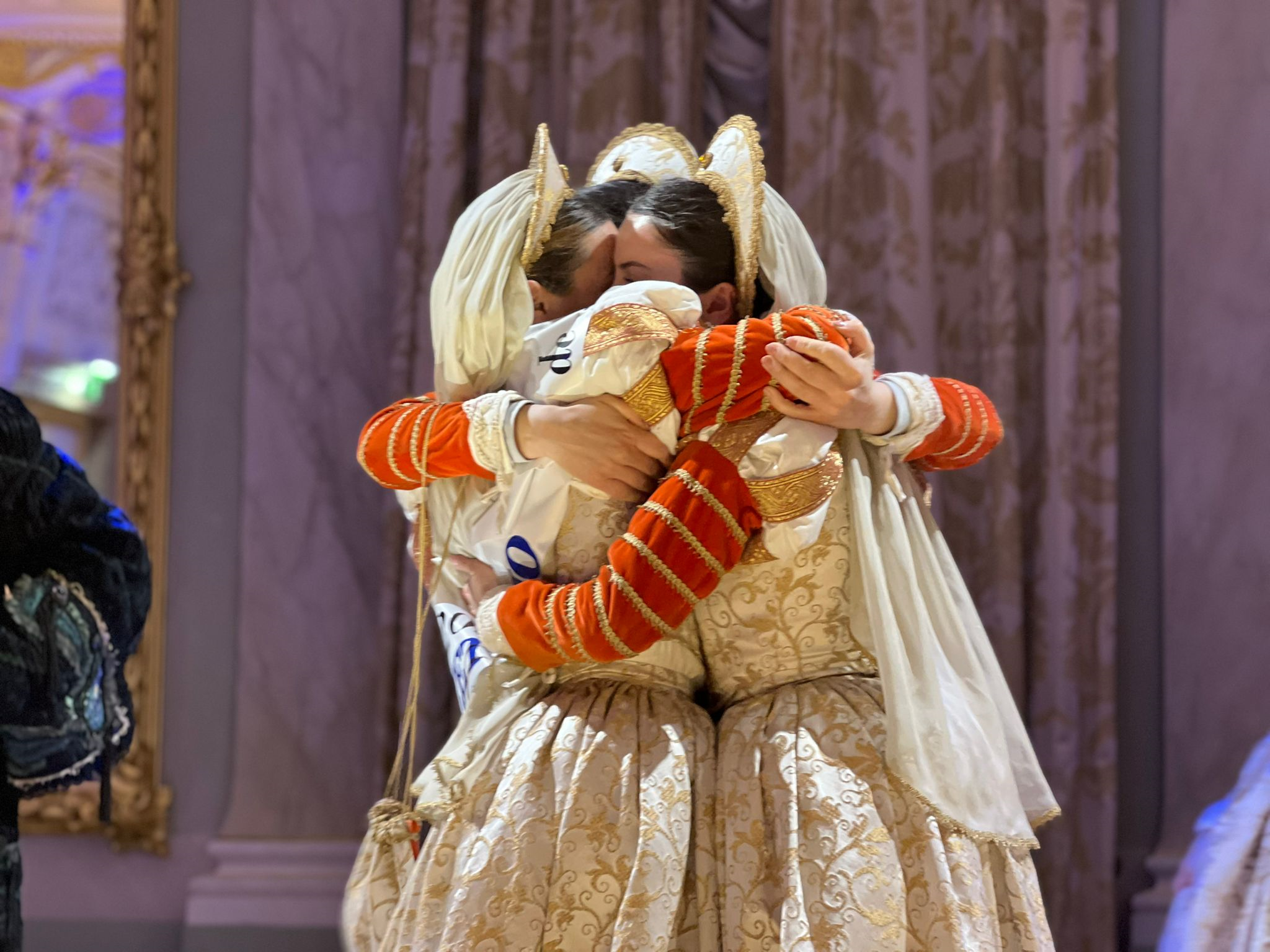 Tra la commozione generale, l’abbraccio tra le due regine del Carnevale di Venezia circondate dall’affetto delle altre dieci bellissime Marie in gara.