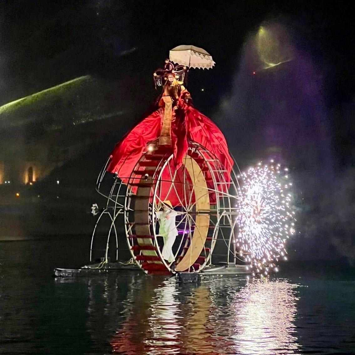 A introdurre nel clima è la suggestiva scenografia che mescola arte e tecnologia in video, fontane danzanti e luci, riproducenti tra l’altro anche una Basilica di San Marco e un Ponte di Rialto immateriali ma affascinanti. La mente vola quindi fino alla Cina, tra il classico dragone e l’esibizione di 5 giovani danzatrici orientali, che introducono al mistero delle antiche leggende. E poi 9 performer della Compagnie Ilotopie, direttamente dalla Francia. Né poteva mancare Marco Polo, interpretato da due attori, che recitano il testo di Alberto Toso Fei accompagnati dalle imbarcazioni dell’Associazione Vela al Terzo.