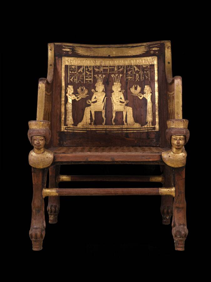 In dialogo con queste figure c’è la poltrona dorata di Sitamun, figlia di Amenofi III: un oggetto domestico usato in vita e poi deposto come dono nella tomba dei nonni, testimonianza rara di affetto e continuità familiare.