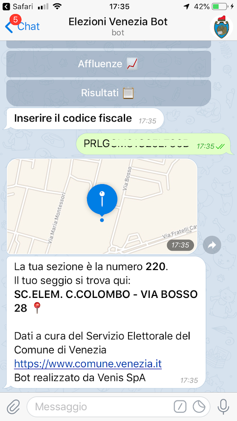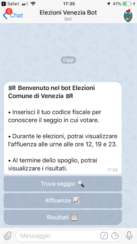 Ora, la possibilità di sapere in anteprima come procedono le operazioni elettorali, è aperta a tutti e in particolare ai residenti del Comune di Venezia: novità assoluta di questa tornata elettorale è infatti il nuovo bot Telegram “Elezioni Venezia” realizzato dall’Ufficio elettorale del Comune e da Venis Spa, la società partecipata del Comune che si occupa dell’infrastruttura digitale (hardware, software e networking) della città.