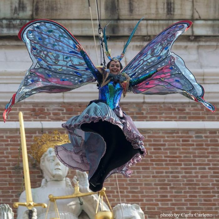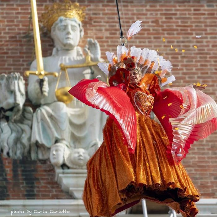 “Mi vengono in mente due fatti simpatici legati alle sponsorizzazioni del Carnevale di Venezia – racconta Nicolao – il primo risale a tantissimi anni fa quando non c’era il volo dell’Angelo bensì quello della Colombina. Siccome lo sponsor era un noto marchio di scarpe, ho dovuto accettare che lo splendido abito realizzato per la Colombina che scendeva dal Campanile di San Marco fosse abbinato a delle terribili scarpe da ginnastica rosa fucsia e non alle eleganti scarpette di raso che avevo realizzato.