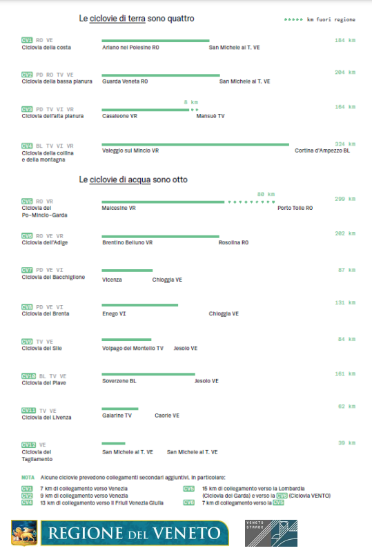 La “Ciclovia dell’alta pianura” unisce invece, con un percorso di 164 km, la veronese Casaleone e la trevigiana Mansuè.