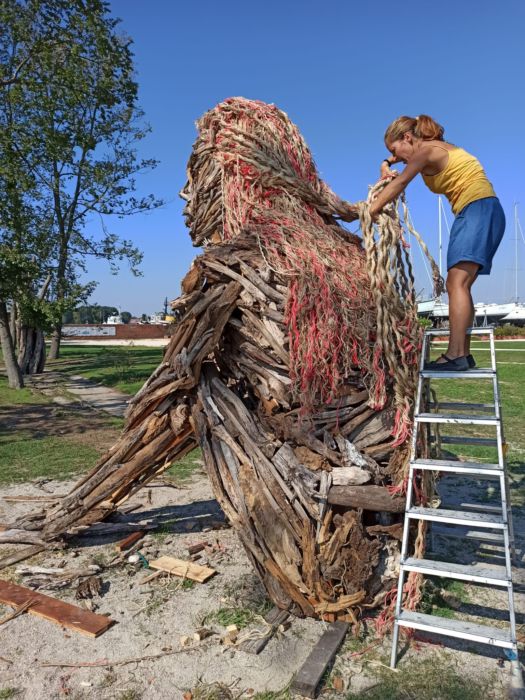 In concomitanza con l’esposizione del Leone alato alla Mostra del cinema di Venezia, prima grande manifestazione internazionale dopo il lockdown, Marco è stato chiamato quindi nell’isola della Certosa per realizzare “La Custode”, grazie al “materiale lagunare” di scarto prodotto da Arborete durante la sistemazione del parco: dai moraletti di legno che ne compongono la struttura, ai rami e le cortecce che danno la forma alla donna, fino alle corde di scarto dei traghetti dell’Actv per i capelli.
