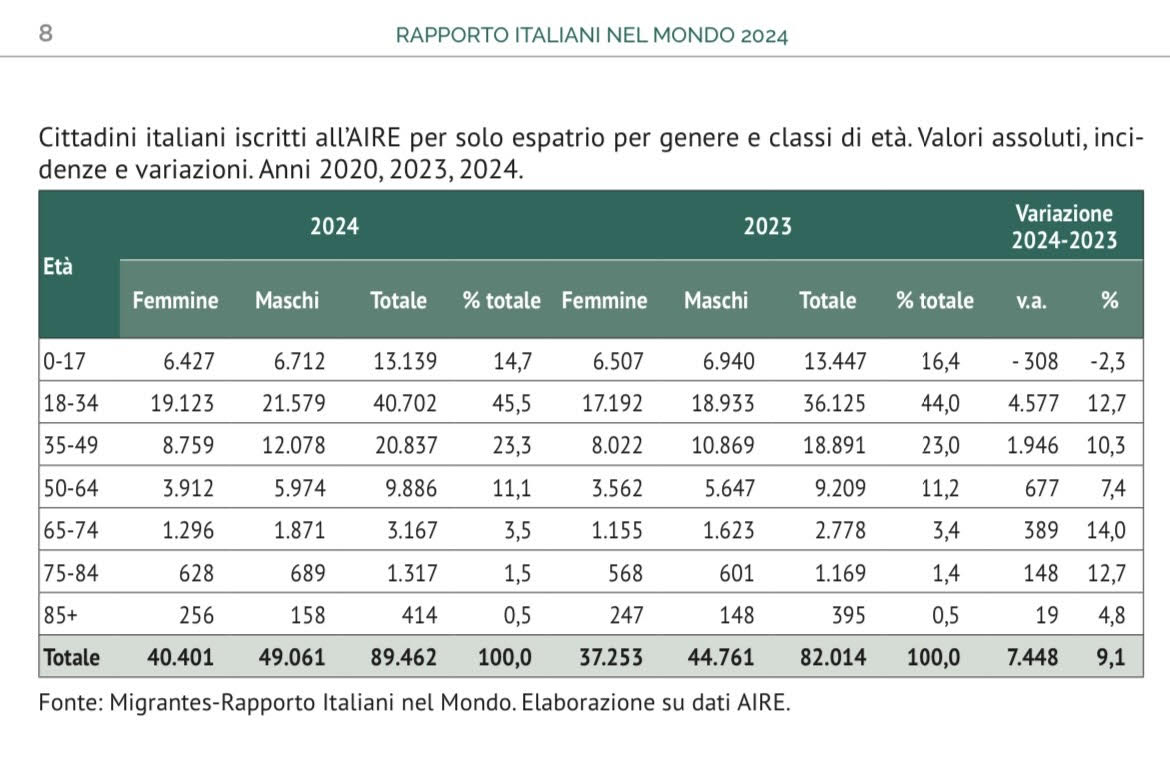 Una tendenza che deve far riflettere è anche l’età sempre più giovane di chi sceglie di espatriare. Perché è vero che la variazione più consistente dei flussi in uscita riguarda gli over 65: +12,9%, che sale al +14% nella fascia tra 65 e 74 anni. Sul totale, quella che viene definita “mobilità previdenziale” incide però solo per il 5,5%, con il 45,5% dei nuovi iscritti all’Aire per solo espatrio che ha tra 18 e 34 anni.