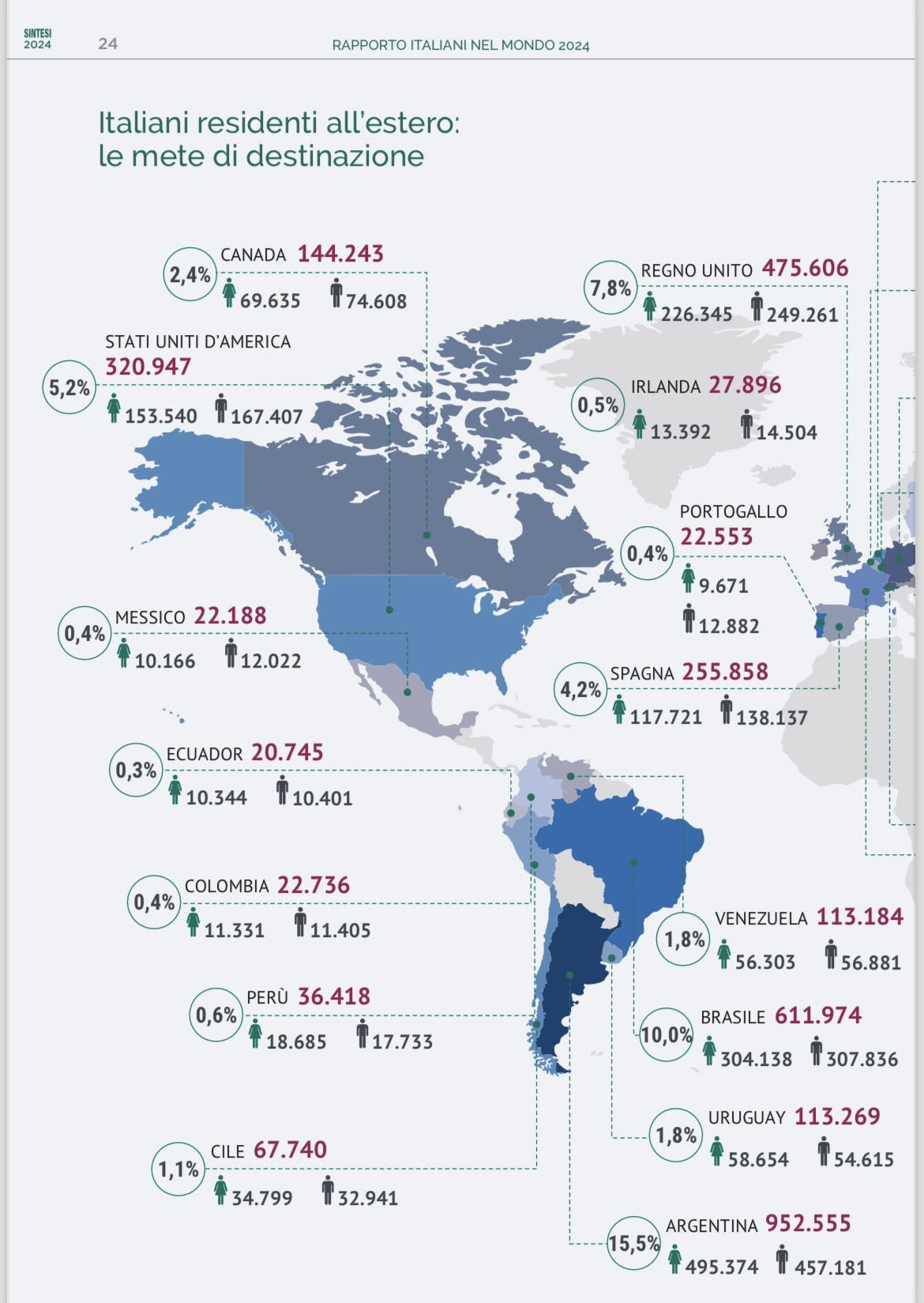 Il 23,2% del totale degli italiani che risiedono attualmente all’estero ha dunque tra 35 e 49 anni, il 21,7% da 18 a 34 anni, il 19,5% tra 50 e 64 anni, più un 14,6% di minorenni e un 21% di anziani. E se il 48,5% è emigrato da oltre 15 anni, c’è stato il sorpasso (51,5%) di chi si è trasferito da meno di 15 anni, con il 28,2% che lo ha fatto da almeno 5 anni e il 23,3% nell’ultimo lustro.