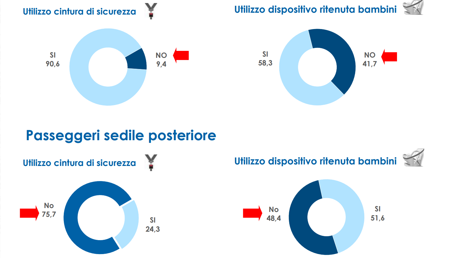 “Nel 41,7% dei casi – rileva ancora lo studio – non vengono utilizzati i dispositivi per la ritenuta dei bambini sui sedili anteriori e la percentuale sale al 48,4% in caso di bambini nei sedili posteriori. Infine, il 10,3% dei conducenti usa impropriamente il telefono cellulare e l’11,4% non indossa la cintura di sicurezza, dato che aumenta vertiginosamente per i passeggeri sul sedile posteriore (75,7%)”.
