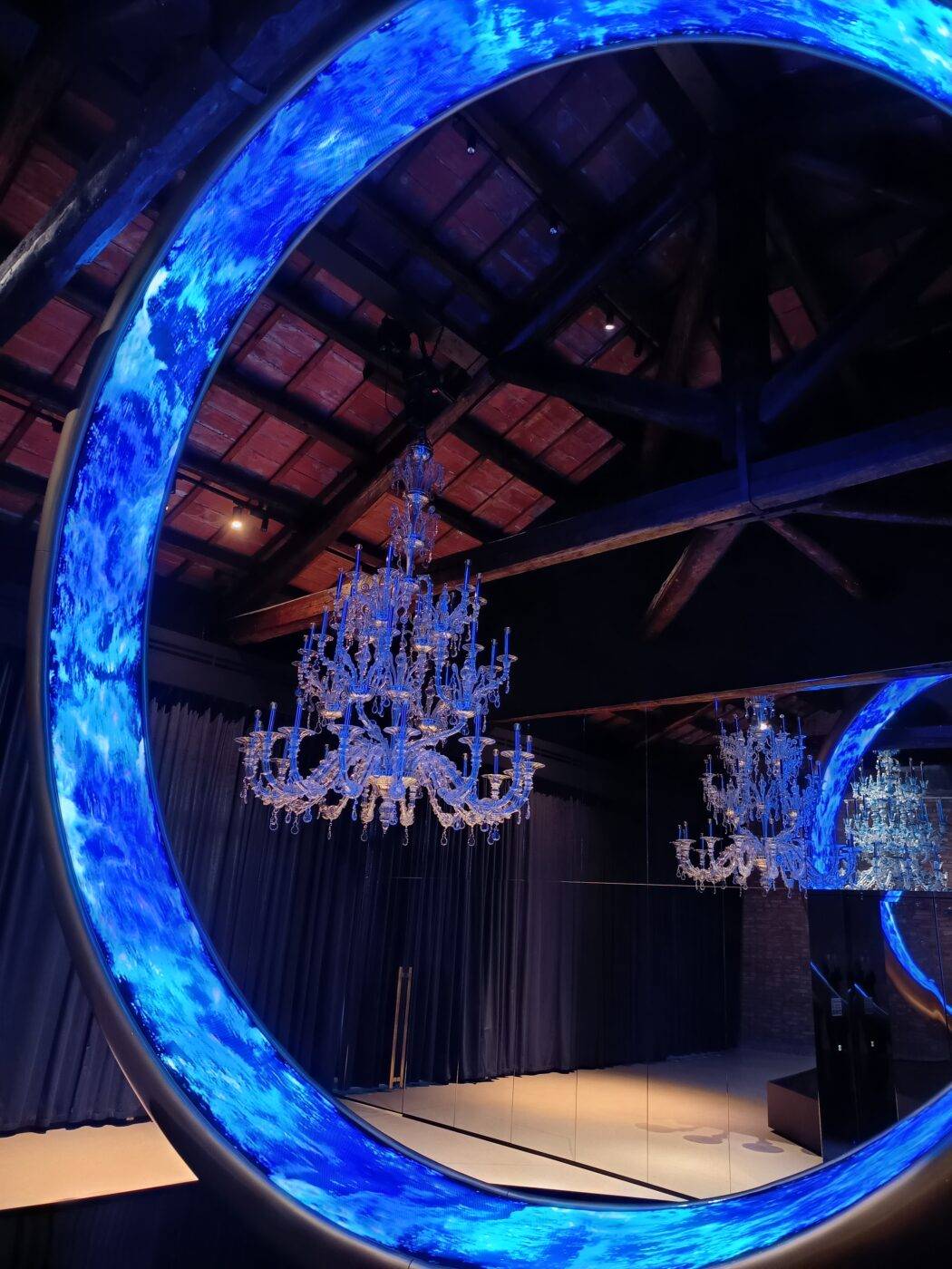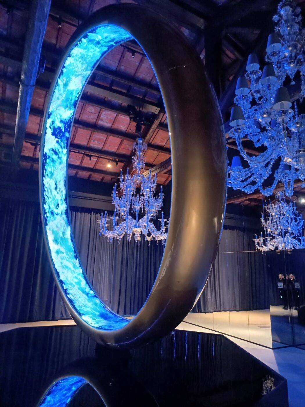 La struttura, in acciaio e pannelli al Led, è illuminata internamente da luci e immagini fluide di color “azzurro Plessi” che girano vorticosamente”, spiega l’artista.