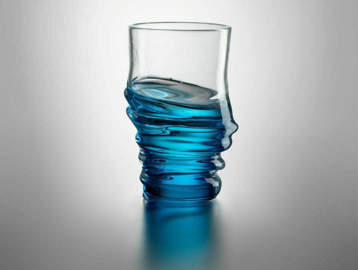 “Ho voluto cimentarmi con gli archetipi fondamentali della produzione vetraria, la bottiglia e il bicchiere, ma a modo mio: 36 bottiglie più una in formato XL e 40 bicchieri, tutti diversi l’uno dall’altro. Ne è nata la mostra “Perdersi in un bicchier d’acqua”.