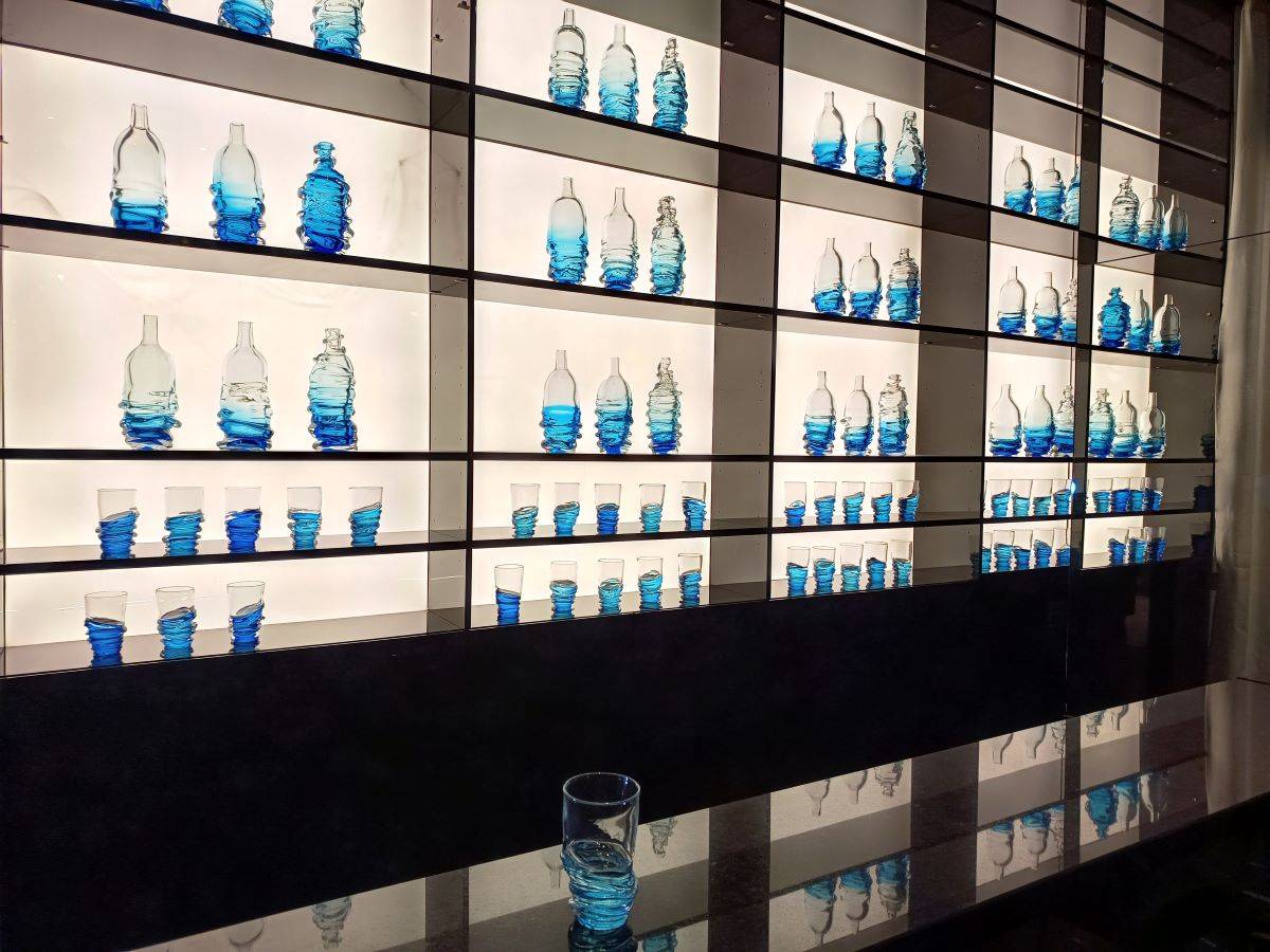 “Perdersi in un bicchier d’acqua” si apre in uno “spazio bar” che introduce la galleria Barovier&Toso ARTE aperta a Murano circa un anno fa e dedicata ad artisti contemporanei che vogliono confrontarsi con il vetro.