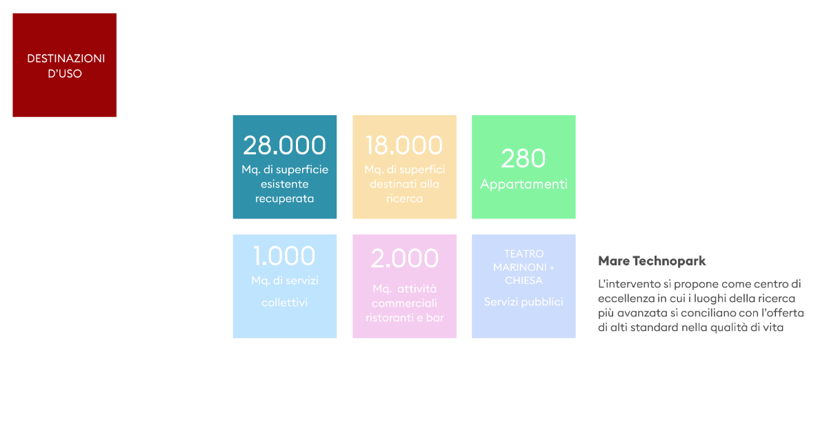 Accanto ai 18 mila metri quadri di superfici destinati alla ricerca, sono previsti dunque più di 21 mila metri quadri di area verde, 2 mila di attività commerciali, ristoranti e bar, 1.000 di servizi collettivi e 280 nuovi appartamenti.