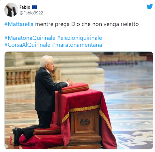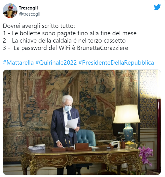 Ma basta molto meno, per strappare un sorriso. Così la foto dietro la scrivania con un foglio in mano diventa il passaggio di consegne al suo successore, con l’indicazione di alcune indicazioni quotidiane (dal posizionamento della chiave della caldaia all’improbabile password “BrunettaCorazziere” del wifi del Quirinale). E la preghiera sull’inginocchiatoio di una chiesa si ipotizza che sia rivolta a Dio per non essere rieletto.