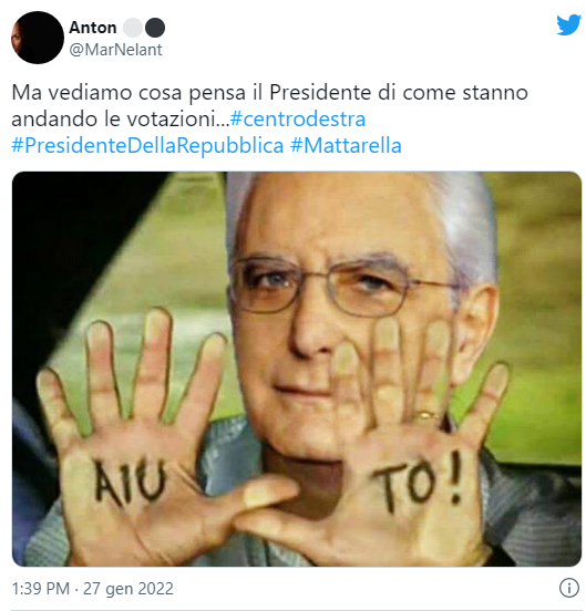 Aiuto” (con un’espressione significativa sul volto di Mattarella) è il pensiero che per qualcuno attraversa la mente del Presidente mentre vede crescere nelle grafiche tv, dal divano di casa, i voti a suo favore. Oppure, in un fotomontaggio basato su un frame di un film di Aldo, Giovanni e Giacomo, è quel che ha scritto sulle mani, ostaggio all’interno di una macchina lanciata verso il nulla (come molti temono stia rischiando l’Italia).