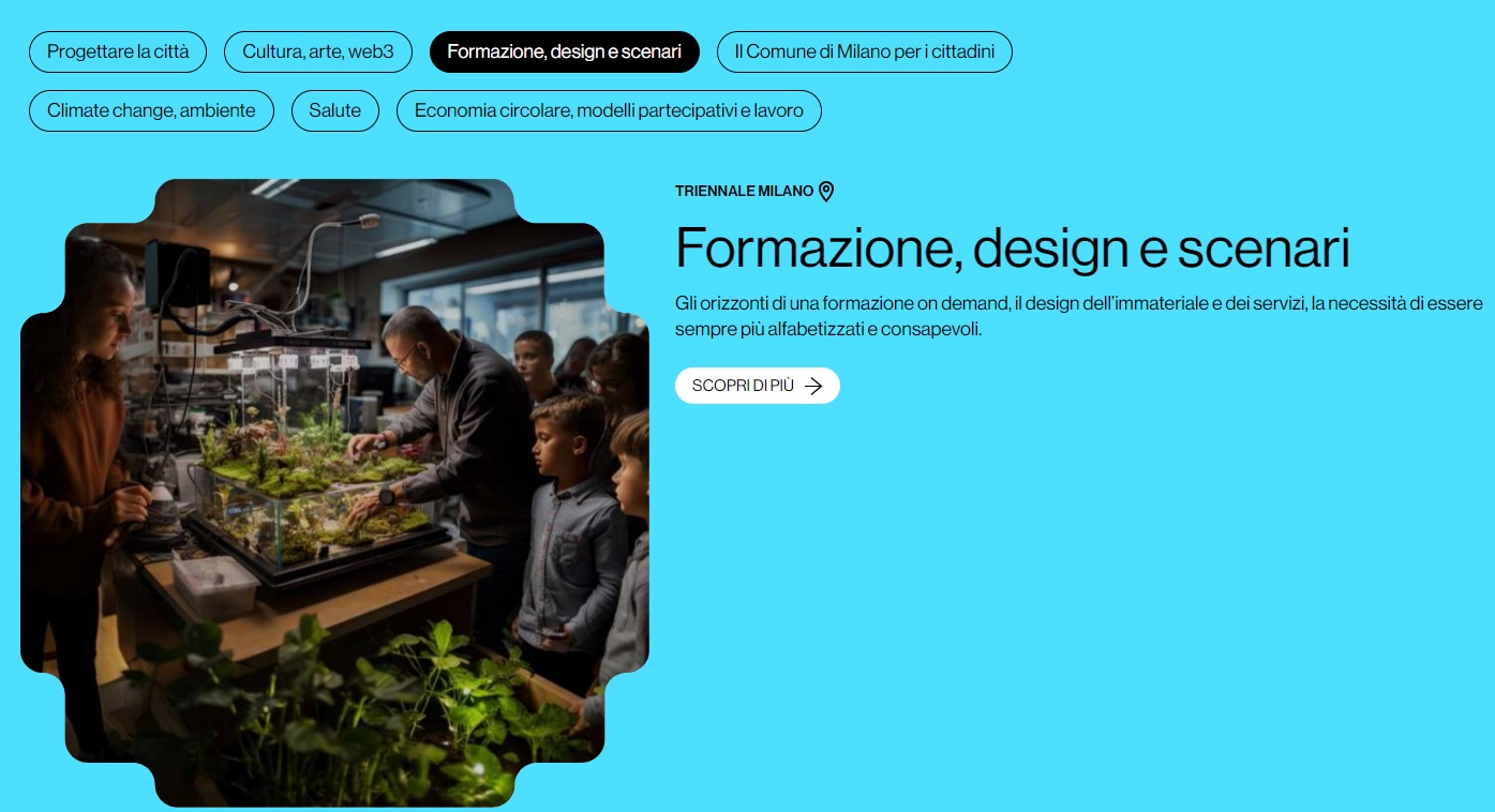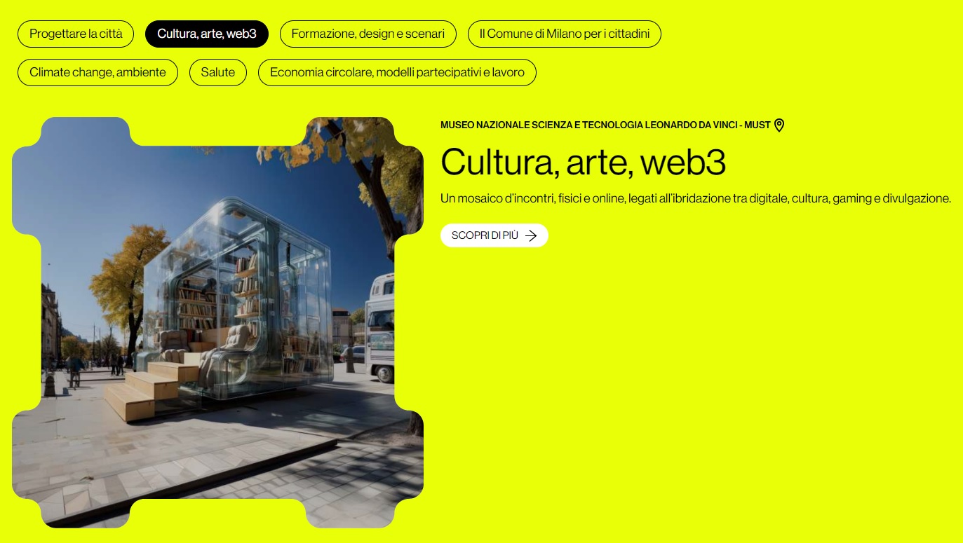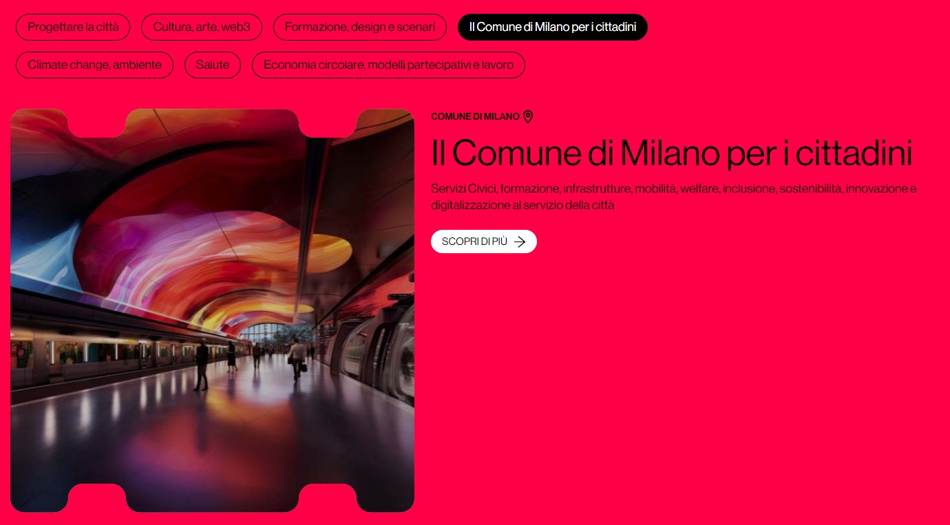 Milano Digital Week propone una serie di canali tematici: da “Progettare la città” a “Cultura, arte, web3”, da “Formazione, design e scenari” a “Climate change, ambiente”. E poi “Salute” e “Economia circolare, modelli partecipativi e lavoro”, fino alla sezione dedicata a “Il Comune di Milano per i cittadini”.