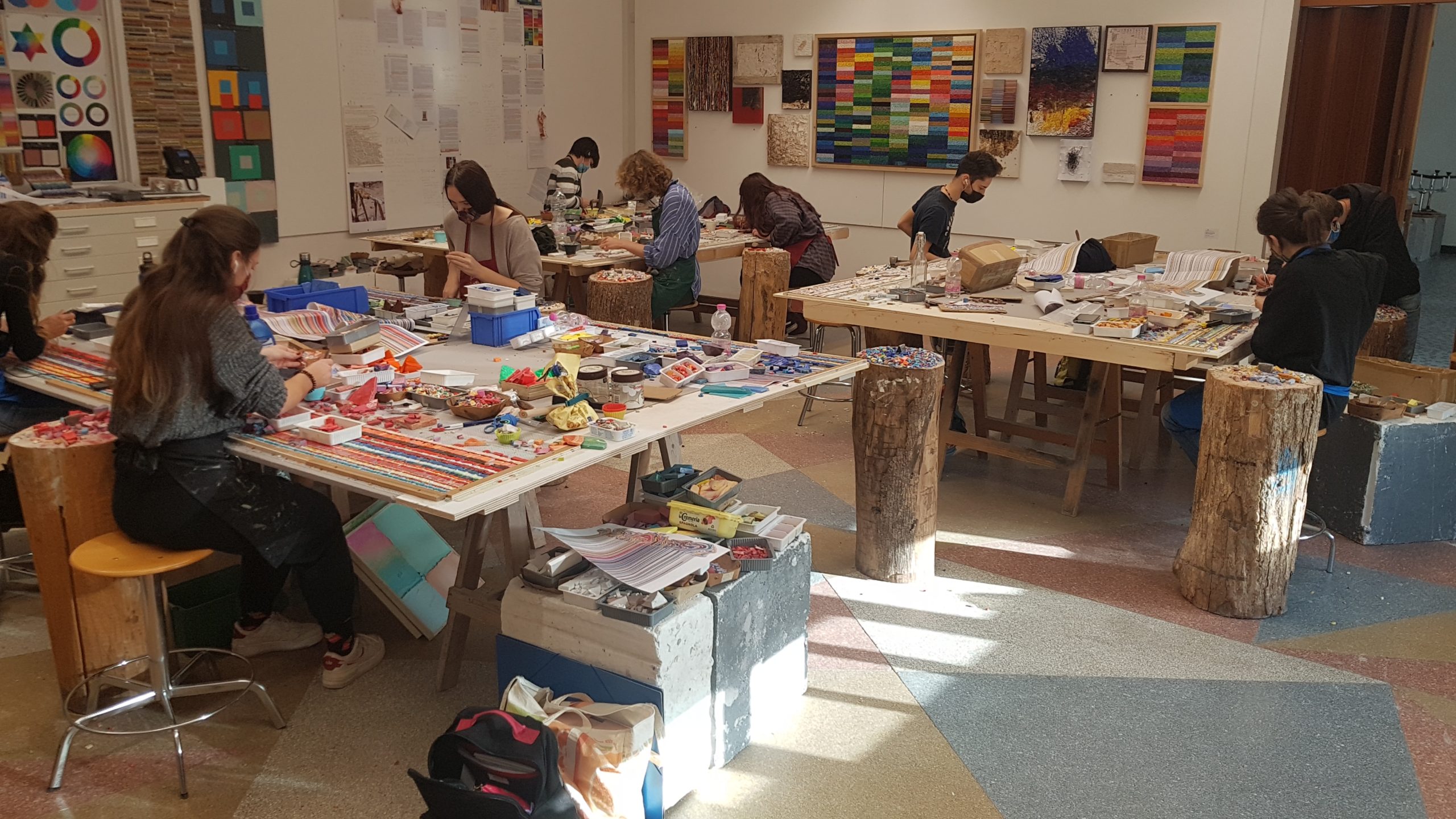 Ovvio allora che sia friulana la scuola che forma i più grandi mosaicisti al mondo. E infatti si trova a Spilimbergo, in provincia di Pordenone. Il prossimo anno festeggerà un secolo dalla fondazione, avvenuta il 3 gennaio 1922. In questa scuola arrivano ancor oggi studenti da ogni angolo del pianeta. Attualmente sono 22 le nazionalità presenti e le allieve sono la maggioranza. Studenti che affrontano un percorso di studi di tre anni, più un quarto di perfezionamento e che imparano diverse tecniche musive dove tradizione a innovazione vanno a braccetto. Sui banchi di scuola però ci sono martelline, taglioli, stucco, colla, resine, pietre e smalti ma anche materiali diversi, naturali o artificiali, riciclati o di recupero.