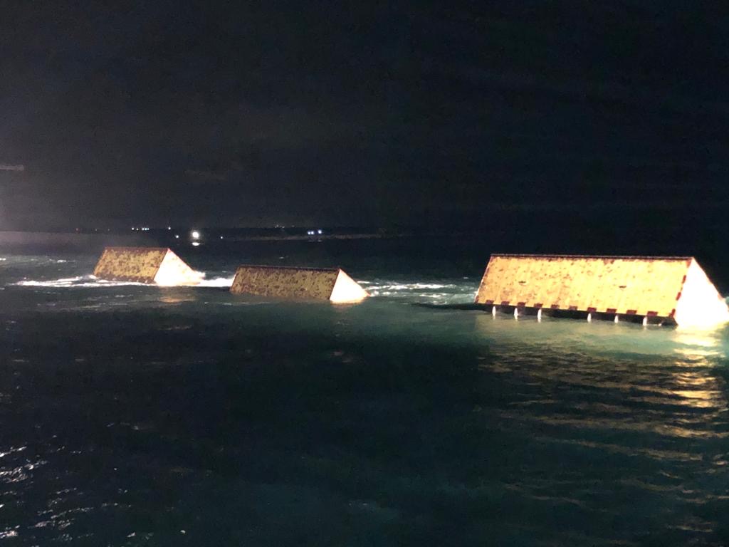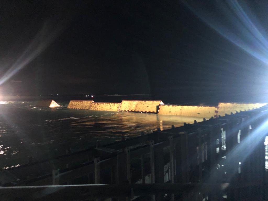 Nell’arco di poco meno di 4 ore, le diciannove paratoie gialle del Mose alla bocca di porto di Malamocco sono emerse dalle acque.