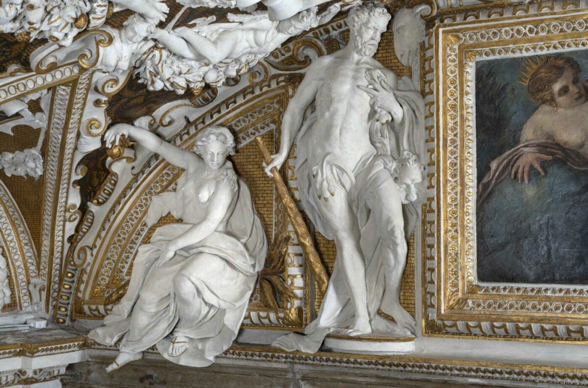 In particolare, i lavori sul sontuoso soffitto hanno interessato sia la parte strutturale, sia i dipinti murali e gli stucchi, i portali e le finestre lapidei, i gruppi scultorei e le tele dipinte a monocromo. La mappatura dello stato di conservazione, ispezioni e una campagna di analisi hanno consentito di individuare strati aggiunti alla pellicola pittorica originale.