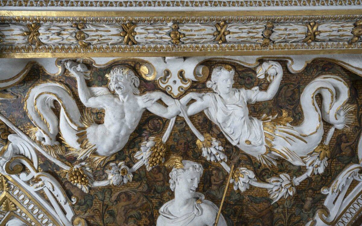 Seppure ufficialmente la Sala delle Quattro Porte riapra adesso al pubblico, nel corso dei lavori di restauro, è stato comunque possibile la vista delle sue decorazioni con l’allestimento di un “cantiere aperto” al primo piano lungo il percorso di palazzo Ducale che ha consentito di osservare i restauratori al lavoro sulla decorazione parietale dei quattro portali della Sala.