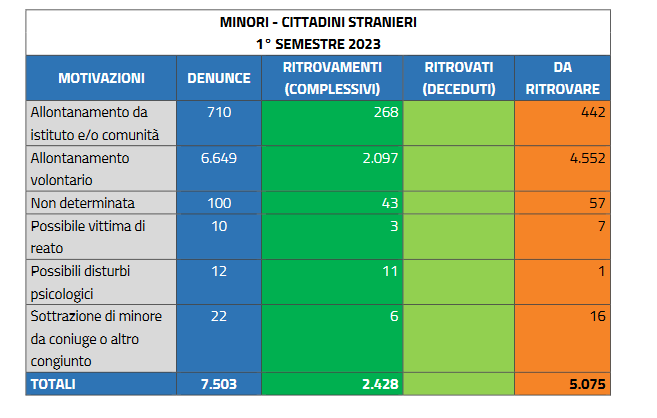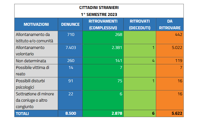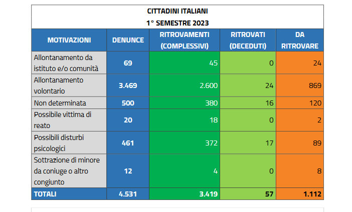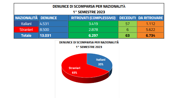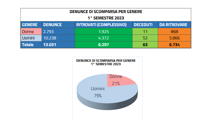Nel solo primo semestre del 2023 (1 gennaio-30 giugno), sono infatti scomparse altre 13.031 persone. Ancora una volta, a fronte dei 6297 ritrovamenti, resta ancora un grande interrogativo su cosa sia accaduto ai restanti 6.734 spariti nel nulla.