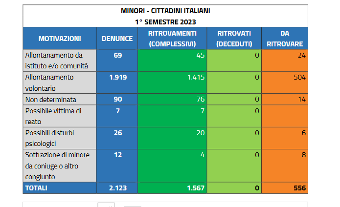 Le denunce di scomparsa di under 18 nel 2023 rappresentano infatti il 74% del totale: sono ben 9626. Riguardano soprattutto ragazzi (7890) e in modo particolare stranieri. Le ragazze scomparse sono 7503.