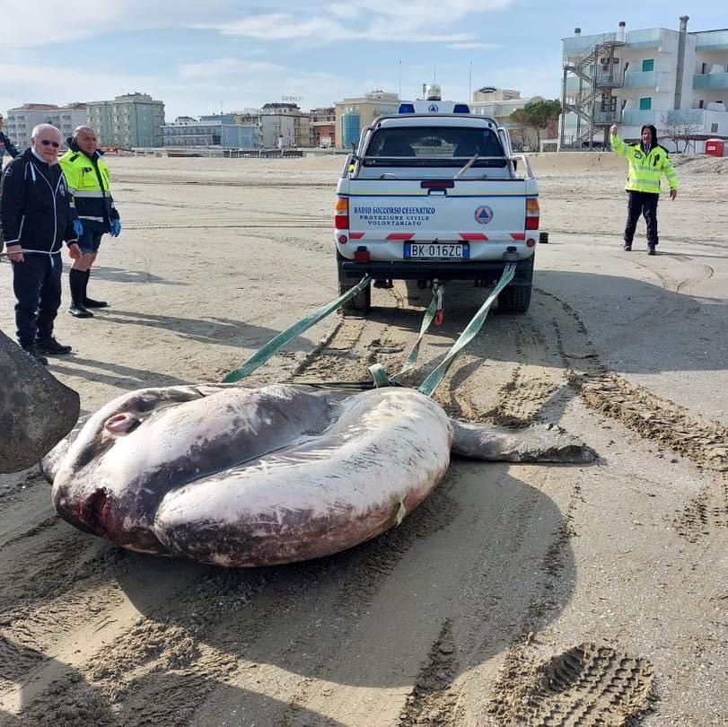 Le immagini del recupero del grosso pesce, per il quale è stato necessario mettere in azione una gru, sono state condivise sul profilo Facebook del sindaco di Cesenatico Matteo Gozzoli. Un evento analogo si era già verificato nel 2008 a Rivabella di Rimini quando fu trovato un pesce luna di oltre tre metri.