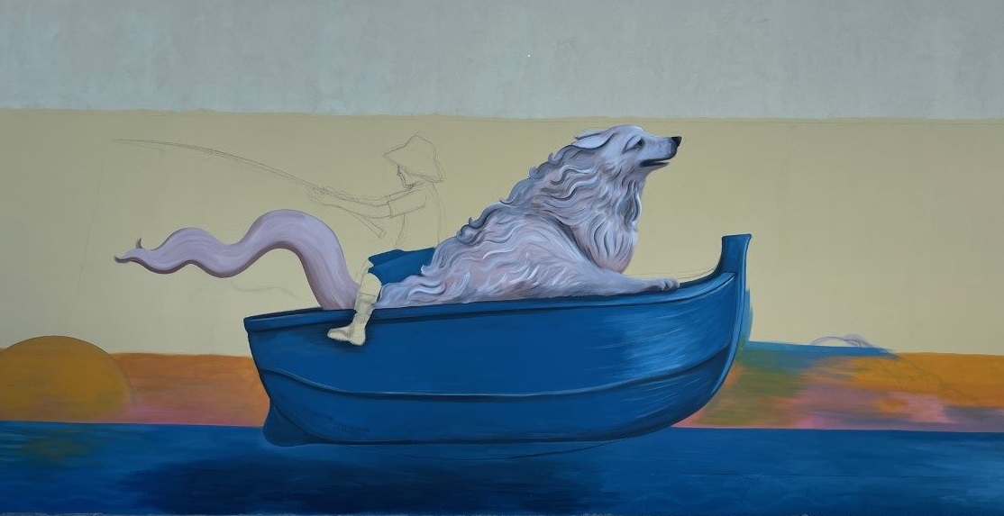 Sulla facciata di una casa popolare, il pastore maremmano è stato disegnato a bordo di una barca, in compagnia di un pescatore.