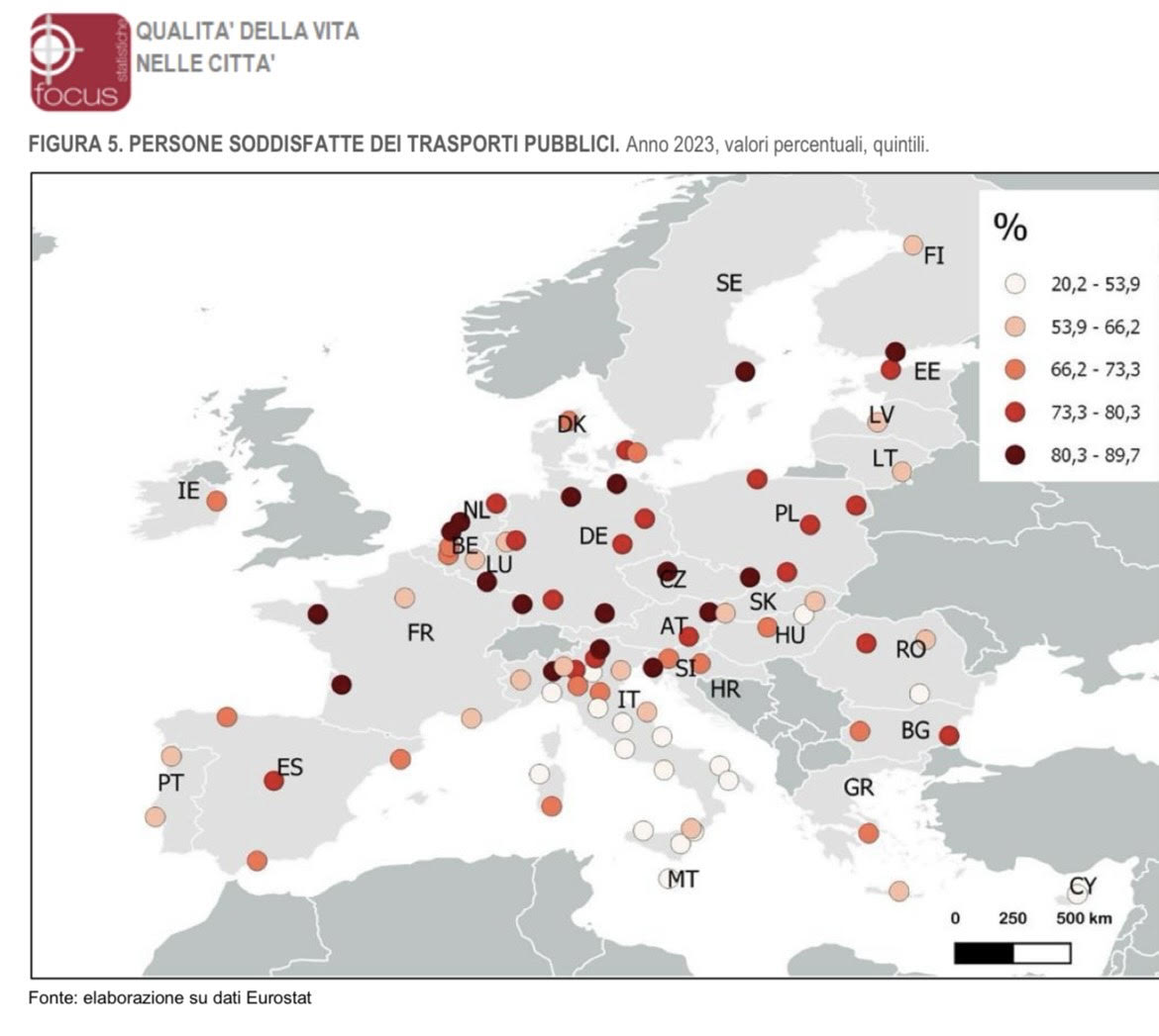 Riguardo ai trasporti pubblici, dove la media italiana è inferiore alle altre città europee, le quote più alte di gradimento sono invece quelle dei residenti a Milano, Trieste e Bolzano. Il Sud si piazza agli ultimi posti per la soddisfazione relativa agli spazi verdi, riguardo ai quali spiccano le città di Trento, Bolzano e Cagliari.