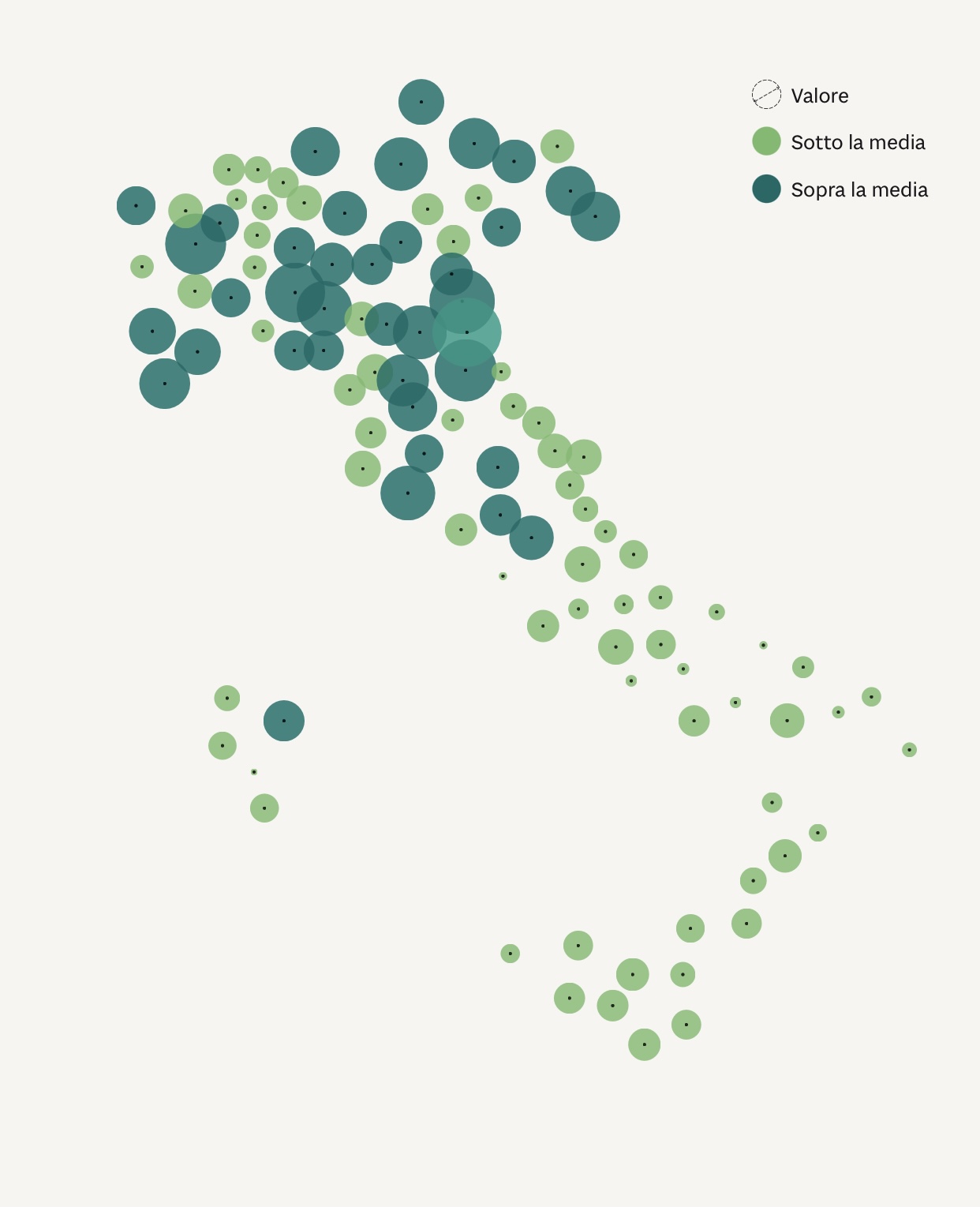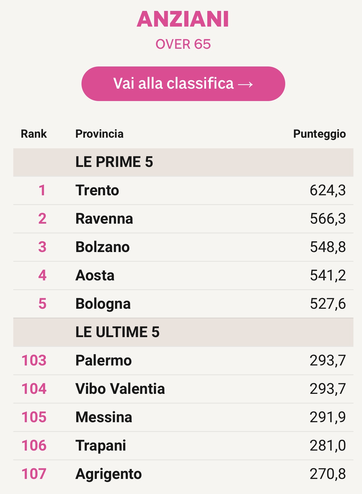 In tutte e 3 le graduatorie il 107° e ultimo posto è appannaggio di realtà del Mezzogiorno: Foggia in quella relativa ai bambini (dove bisogna risalire fino al 99° posto di Genova per trovare una realtà non meridionale), la provincia del Sud Sardegna per i giovani (escludendo Roma, la più bassa tra le province non a Sud è Rimini, 97^) e Agrigento per gli anziani (qui è addirittura l’88° posto di Imperia il più basso per quanto riguarda le province del nord).