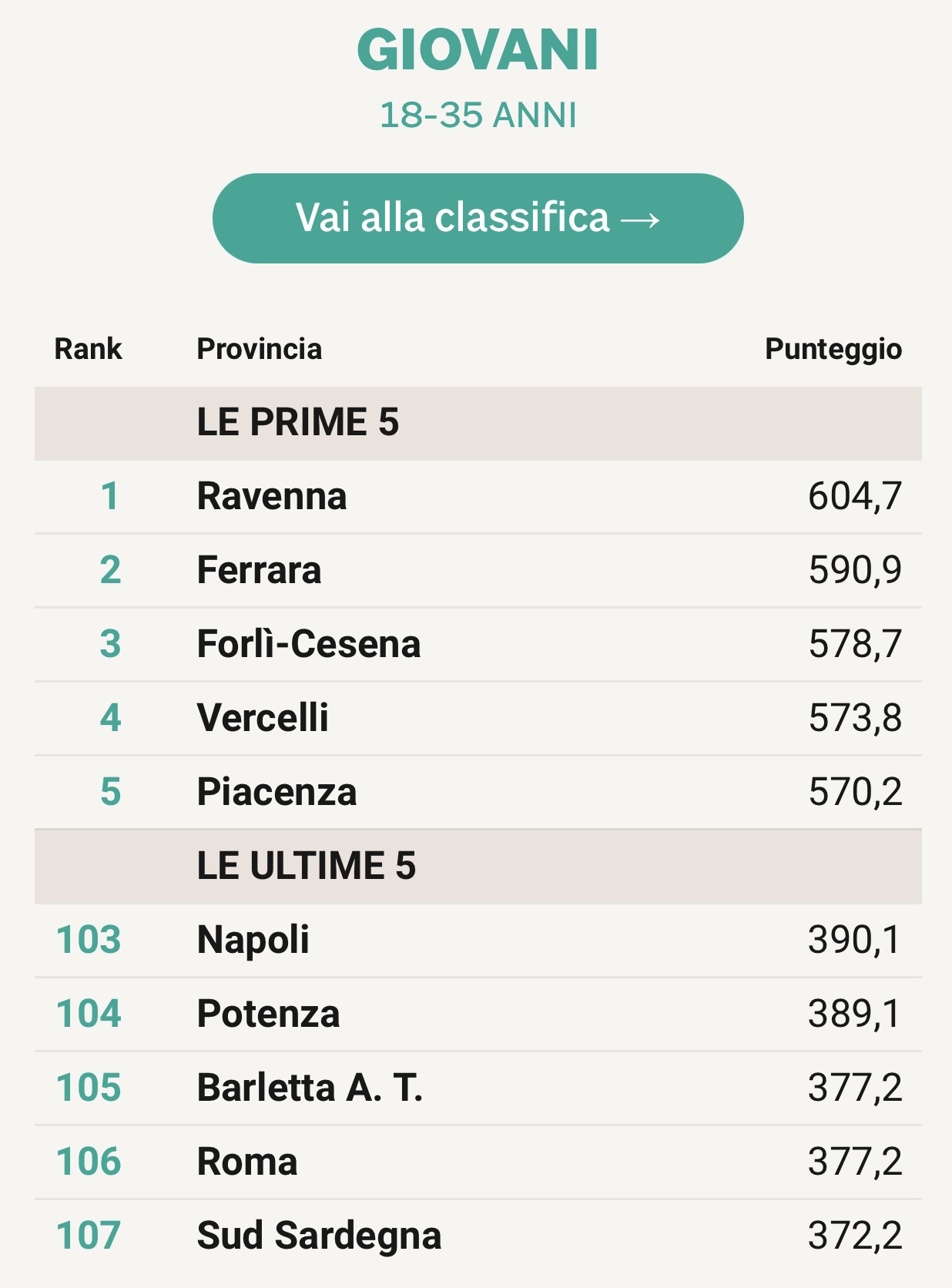 Cagliari, invece, unisce al 1° posto per i bambini (con la Sardegna che piazza anche Oristano, 3^, sul podio) un 25° per gli anziani e un 71° per i giovani maggiorenni fino a 35 anni.