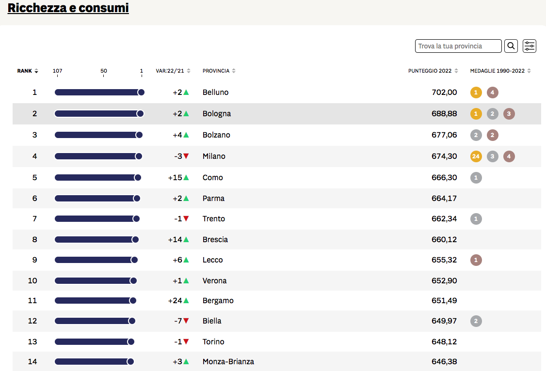 A livello di categorie, Belluno, cittadina veneta ai piedi delle Dolomiti, guida per la prima volta quella di “Ricchezza e consumi”, che comprende depositi bancari delle famiglie risparmiatrici, spesa delle famiglie per il consumo di beni durevoli, riqualificazioni energetiche, spazio abitativo e reddito medio da pensione di vecchiaia, oltre che popolazione con crediti attivi e prezzo medio di vendita delle case.