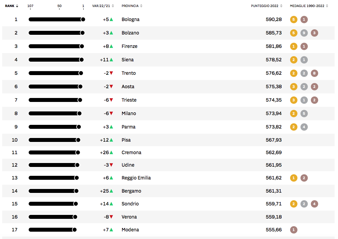 Chi sorride, così, è Bologna, che si riprende dopo un anno la prima posizione tra le province italiane per il livello generale della qualità della vita, calcolato sulla base di 90 indicatori, 40 dei quali aggiornati al 2022.