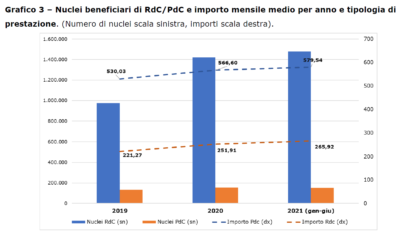 I nuclei beneficiari di almeno una mensilità sono stati nel 2019 1,1 milioni per un totale di 2,7 milioni di persone coinvolte; nel 2020 1,6 milioni per 3,7 milioni di persone.
