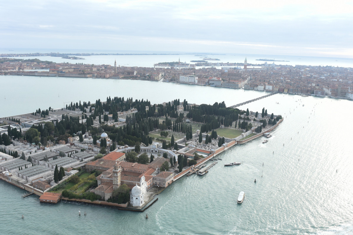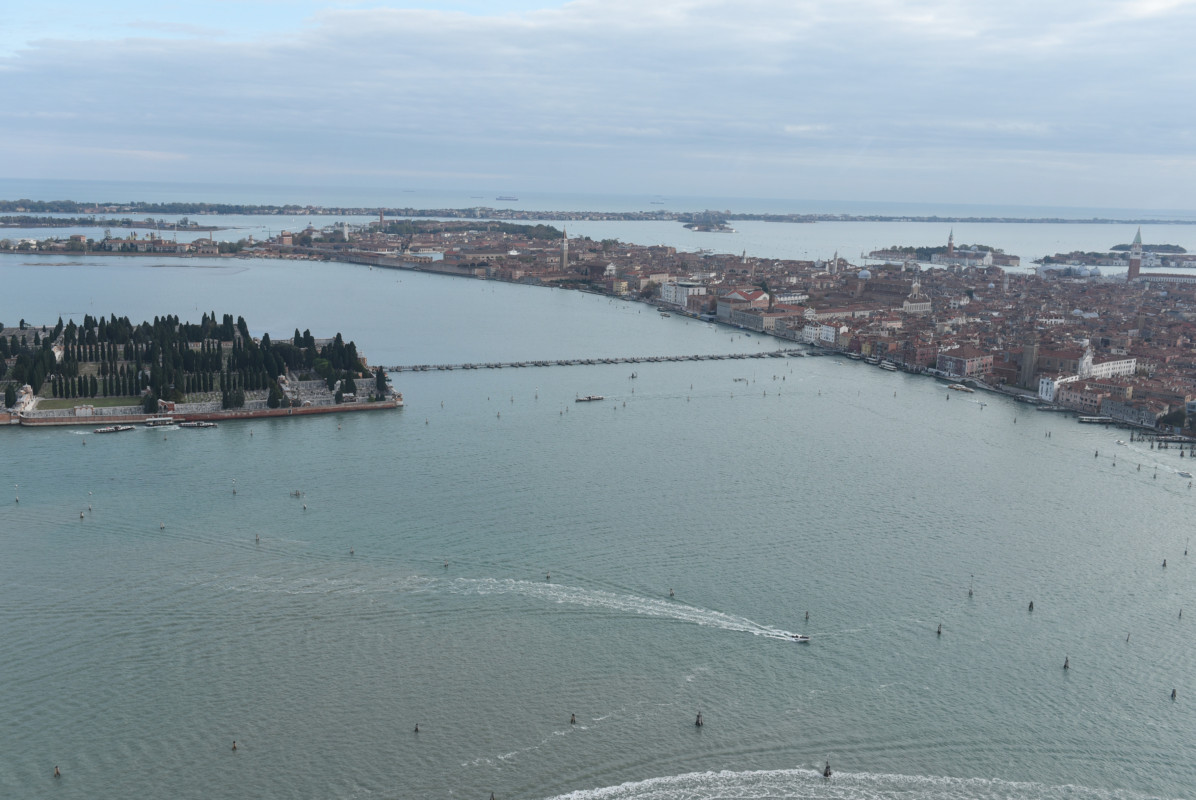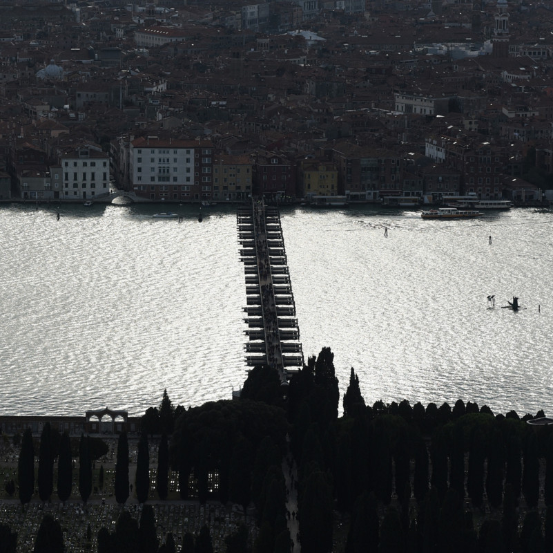 E ora anche il famoso ponte di barche che, come 69 anni fa, dal 31 ottobre al 10 novembre scorsi ha unito, in occasione delle festività dei defunti, Venezia dalle Fondamenta Nove all’isola di San Michele, dove si trova il cimitero. “Con Silvia Rigon della Fly Venice parlavamo di quelle foto del ponte di 70 anni fa, riprese da terra – spiega Roiter Rigoni – Così ci siamo chiesti perché non riprenderlo dall’alto. E così siamo partiti a bordo del Robinson 44, un volo di 6-7 minuti, il tempo di girare attorno l’isola di San Michele. Anche perché, come mi diceva il professor Giorgio Pecorai (decano e memoria storica del Lido scomparso nel 2009, ndr) “Ricordati che ogni foto di attualità un domani sarà una foto d’epoca“. Ecco, queste foto potranno essere “memoria” di un momento che mancava dal 1950”.