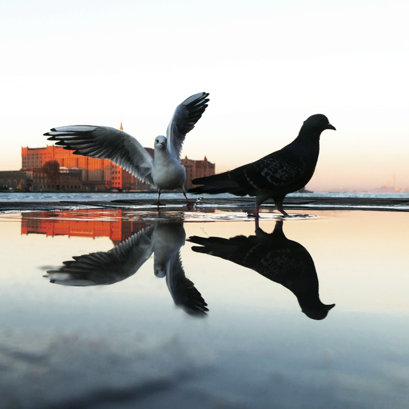 A volare inizia nel 2013. Al Lido c’è l’aeroporto Nicelli e Riccardo, con gli amici piloti, il primo dicembre porta in cielo una maschera da fotografare, la dea nordica della luce Brigit. Nascono gli scatti “Messaggi di luce”. Ma il fotografo volante ricorda molto volentieri quella foto, scelta tra migliaia nel 2015, per la copertina del libro “Marco Patriarca amato da tutti. I 35 anni a Venezia del cardinale Cè”. “Ero alla Curia per una manifestazione e il patriarca si era fermato a parlare con una persona – racconta sempre Riccardo – M’ha fatto un bellissimo sorriso e in quel momento ho fatto click! Ho avuto fortuna”. E’ poi un susseguirsi di collaborazioni. Nel 2018 un prestigioso Folder di Poste Italiane con le più belle foto su Venezia, l’immagine del manifesto della Vogalonga, gli scatti per il “Gioco dell’oca a Venezia”, patrocinato dalla Regione, per l’autrice Debora Basei. Nel 2019 la copertina del catalogo e il manifesto della mostra alla Bevilacqua la Masa “Cinquant’anni di luna nuova” con l’immagine “Moonwalkers”, delle persone che camminano in riva alle Zattere e si rispecchiano in una pozzanghera su cui è riflesso il globo argenteo.
