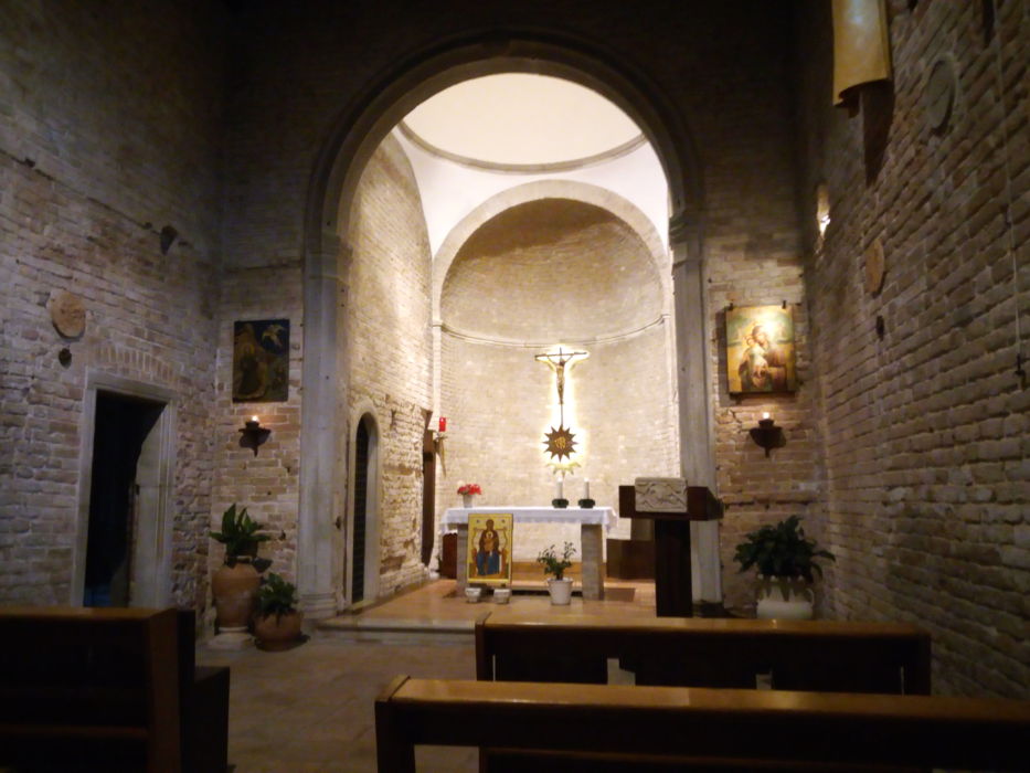 Parte dell’insediamento risale invece al periodo gotico, come lo splendido chiostro trecentesco, detto di San Bernardino, in onore del santo senese che, secondo un’altra leggenda, con un segno della croce rese potabile l’acqua della cisterna inquinata da una falda salmastra.
