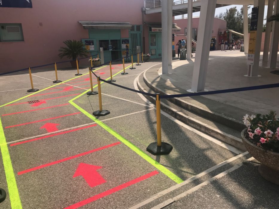 Misurazione della temperatura dei bagnanti in ingresso, percorsi differenziati per entrata e uscita, distanziamento evidenziato da segnaletica orizzontale a terra davanti all’ufficio prenotazioni e postazioni per la disinfezione delle mani.