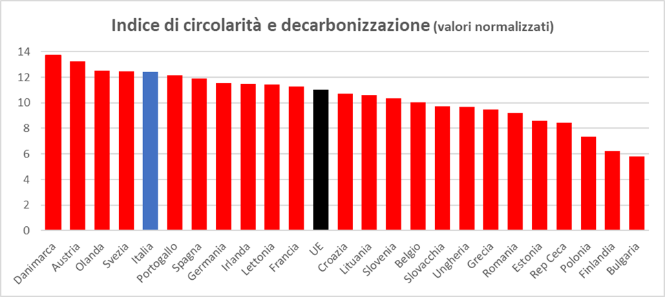 L’Italia resta una potenza nell’economia circolare: riciclo dei rifiuti, uso di materie seconde e sistemi consortili come Cial (alluminio), Ricrea (acciaio) e Biorepack (bioplastiche) continuano a fare scuola in Europa.