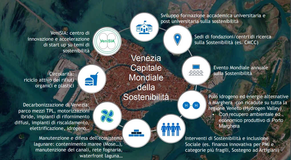 Il primo passo sarà la creazione di un centro di innovazione e accelerazione delle star-up sui temi della sostenibilità che farà di Venezia un centro di riferimento mondiale per la formazione accademica e post-universitaria su queste materie, anche attraverso l’apertura e il potenziamento di sedi di fondazioni e centri di ricerca e l’organizzazione di un evento mondiale annuale sulla sostenibilità.